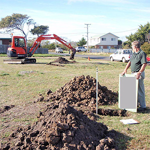 Excavator test pits are best for soil testing for houses. This picture taken in southern Tasmania.